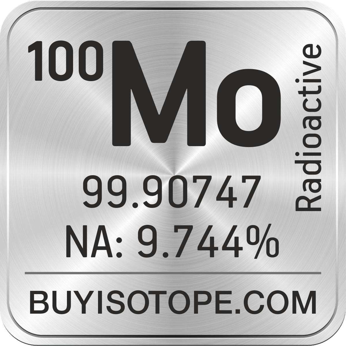 100Mo isotope is available to order from BuyIsotope.com in 100Mo metal (Mo) chemical form and in 100Mo oxide (MoO3) chemical form. Please contact us via request a 100Mo quote BuyIsotope.com to order 100Mo isotope, to get 100Mo price and to buy 100Mo isotope.