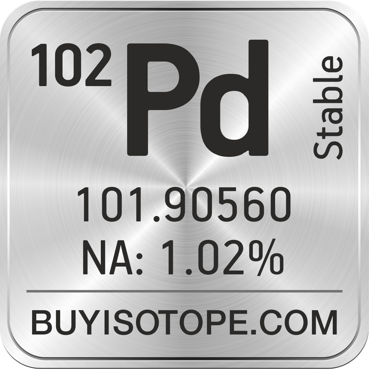 102Pd isotope is available to order from BuyIsotope.com in 102Pd metal ingot (Pd) chemical form and in 102Pd metal powder (Pd) chemical form. Please contact us via request a 102Pd quote BuyIsotope.com to order 102Pd isotope, to get 102Pd price and to buy 102Pd isotope.