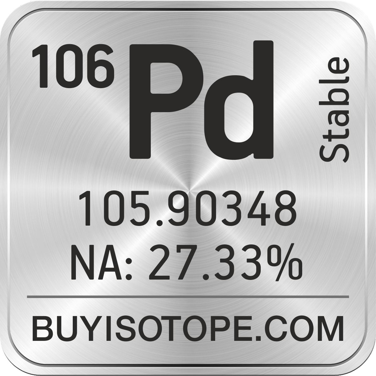 106Pd isotope is available to order from BuyIsotope.com in 106Pd metal ingot (Pd) chemical form and in 106Pd metal powder (Pd) chemical form. Please contact us via request a 106Pd quote BuyIsotope.com to order 106Pd isotope, to get 106Pd price and to buy 106Pd isotope.