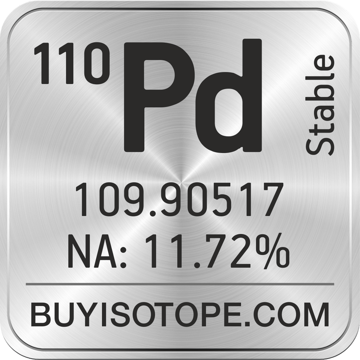110Pd isotope is available to order from BuyIsotope.com in 110Pd metal ingot (Pd) chemical form and in 110Pd metal powder (Pd) chemical form. Please contact us via request a 110Pd quote BuyIsotope.com to order 110Pd isotope, to get 110Pd price and to buy 110Pd isotope.