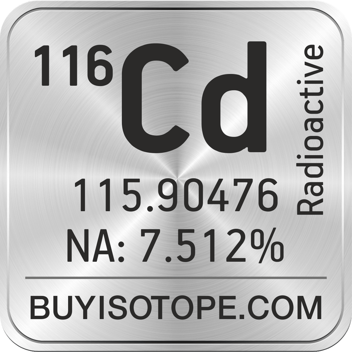 116Cd isotope is available to order from BuyIsotope.com in 116Cd metal (Cd) chemical form and in 116Cd oxide (CdO) chemical form. Please contact us via request a 116Cd quote BuyIsotope.com to order 116Cd isotope, to get 116Cd price and to buy 116Cd isotope.