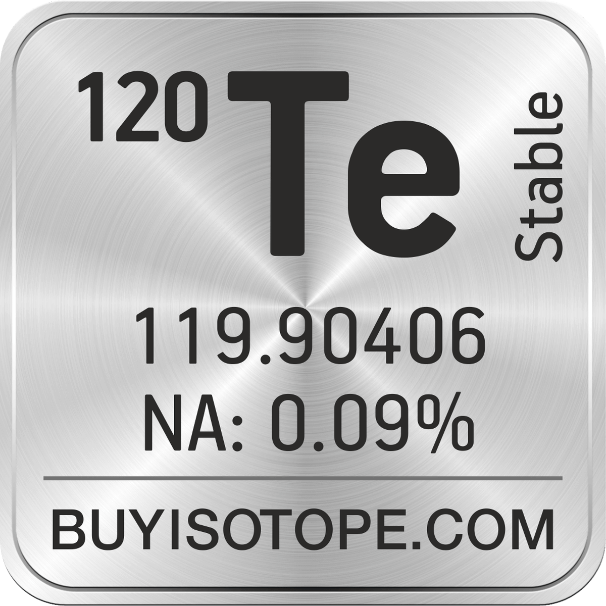 120Te isotope is available to order from BuyIsotope.com in 120Te metal powder (Te) chemical form and in 120Te oxide (TeO2) chemical form. Please contact us via request a 120Te quote BuyIsotope.com to order 120Te isotope, to get 120Te price and to buy 120Te isotope.