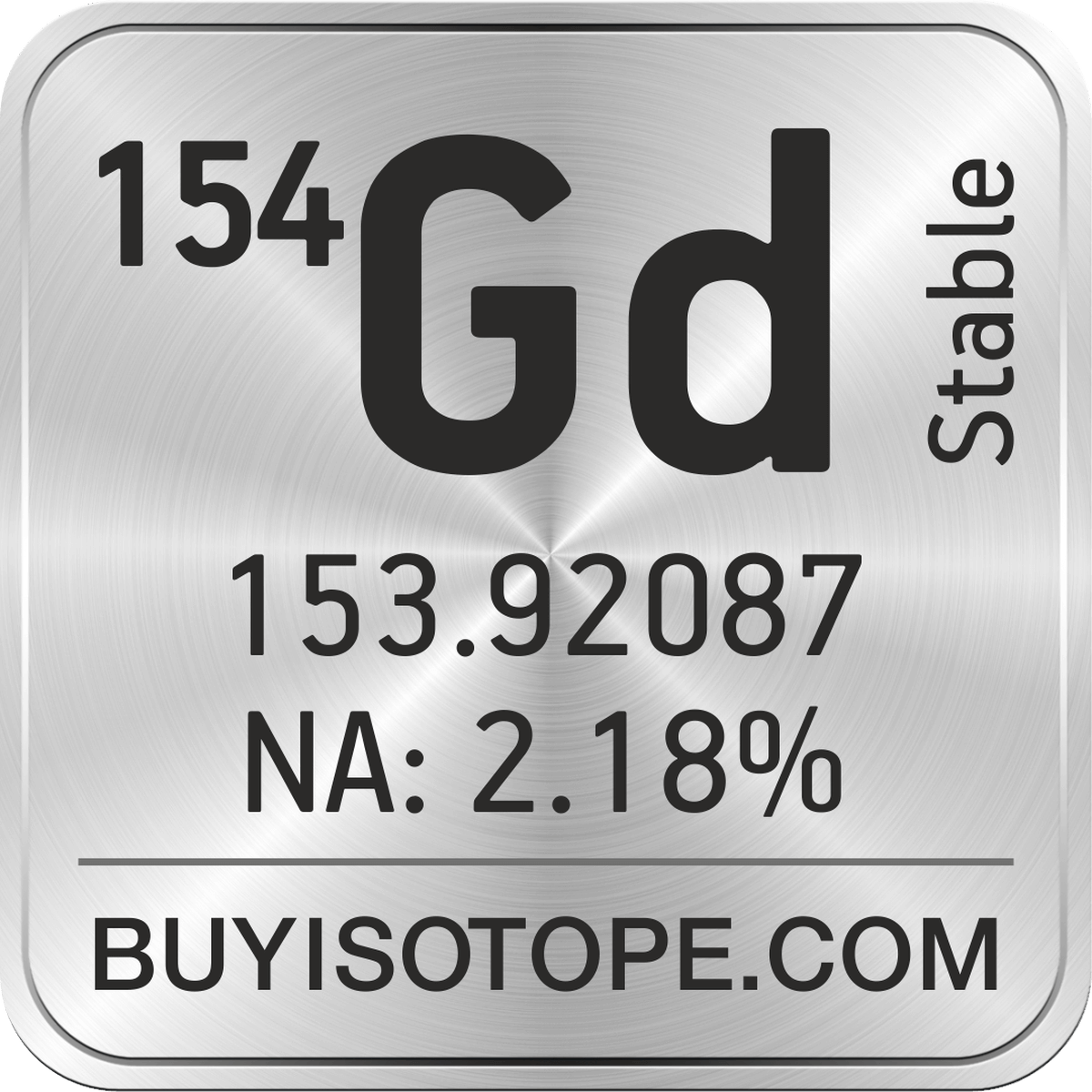 154Gd isotope is available to order from BuyIsotope.com in 154Gd oxide (Gd2O3) chemical form and in 154Gd metal (Gd) chemical form. Please contact us via request a 154Gd quote BuyIsotope.com to order 154Gd isotope, to get 154Gd price and to buy 154Gd isotope.