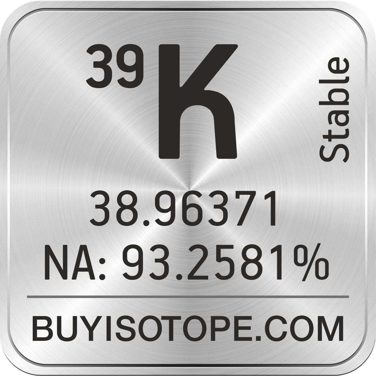 39K isotope is available to order from BuyIsotope.com in 39K chloride (KCl) chemical form. Please contact us via request a 39K quote BuyIsotope.com to order 39K isotope, to get 39K price and to buy 39K isotope.