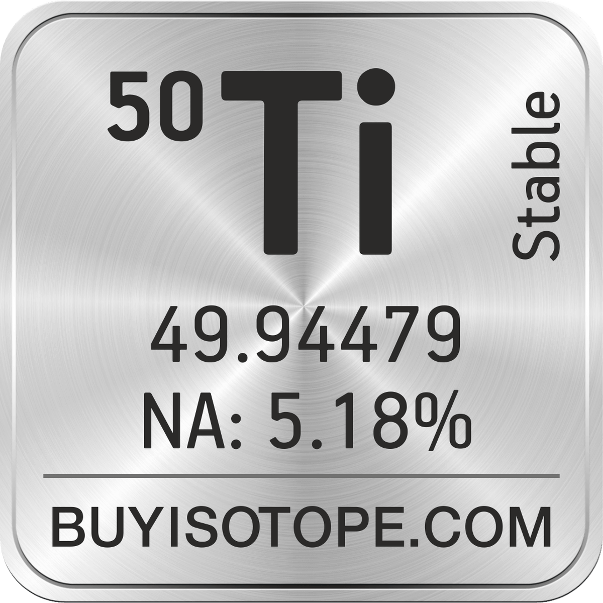 50Ti isotope is available to order from BuyIsotope.com in 50Ti metal powder (Ti) chemical form and in 50Ti oxide (TiO2) chemical form. Please contact us via request a 50Ti quote BuyIsotope.com to order 50Ti isotope, to get 50Ti price and to buy 50Ti isotope.