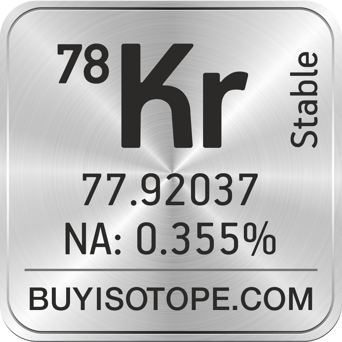 78Kr isotope is available to order from BuyIsotope.com in 78Kr gas (Kr) chemical form. Please contact us via request a 78Kr quote BuyIsotope.com to order 78Kr isotope, to get 78Kr price and to buy 78Kr isotope.