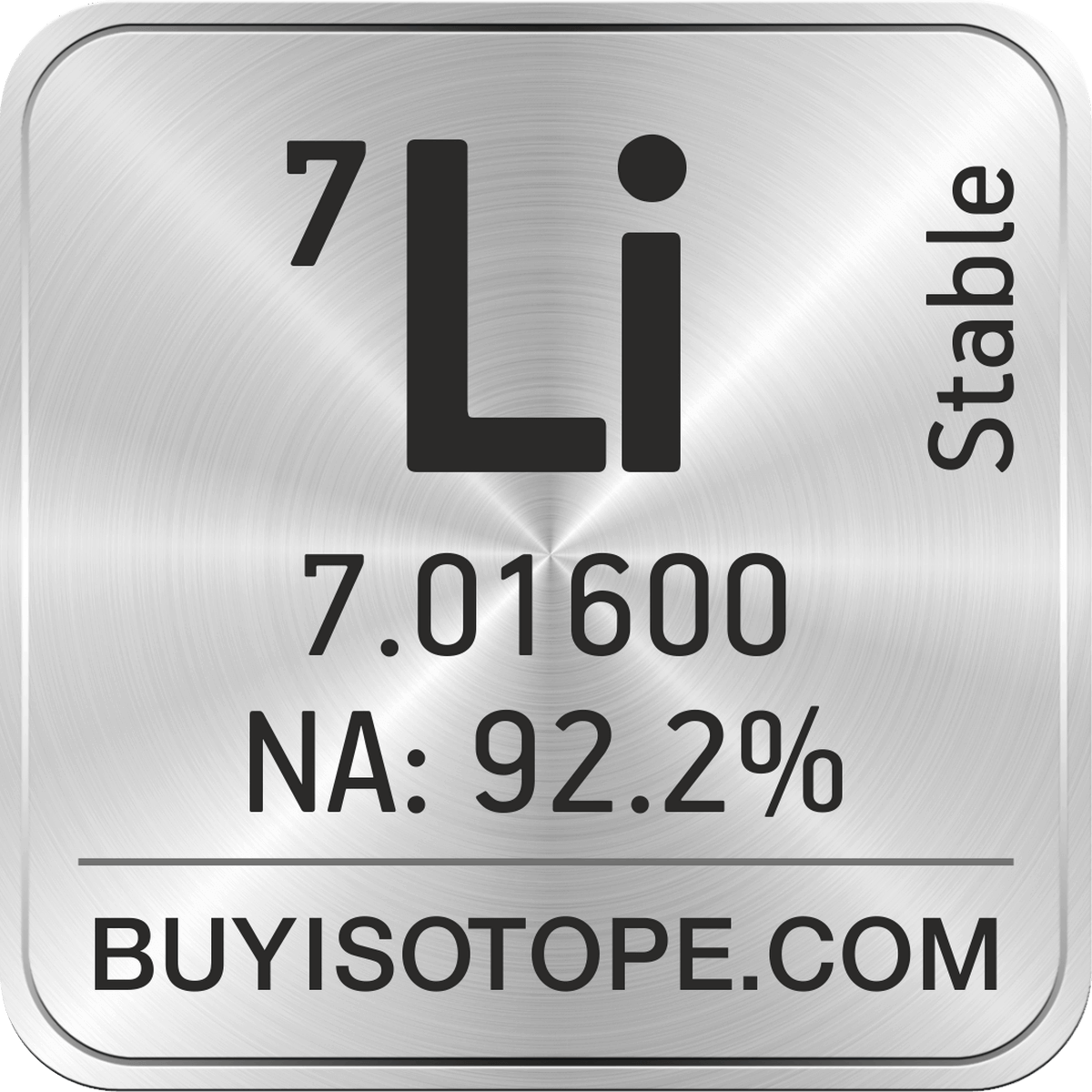 7Li isotope is available to order from BuyIsotope.com in 7Li metal (Li) chemical form and in 7Li hydroxide (LiOH H2O) chemical form. Please contact us via request a 7Li quote BuyIsotope.com to order 7Li isotope, to get 7Li price and to buy 7Li isotope.