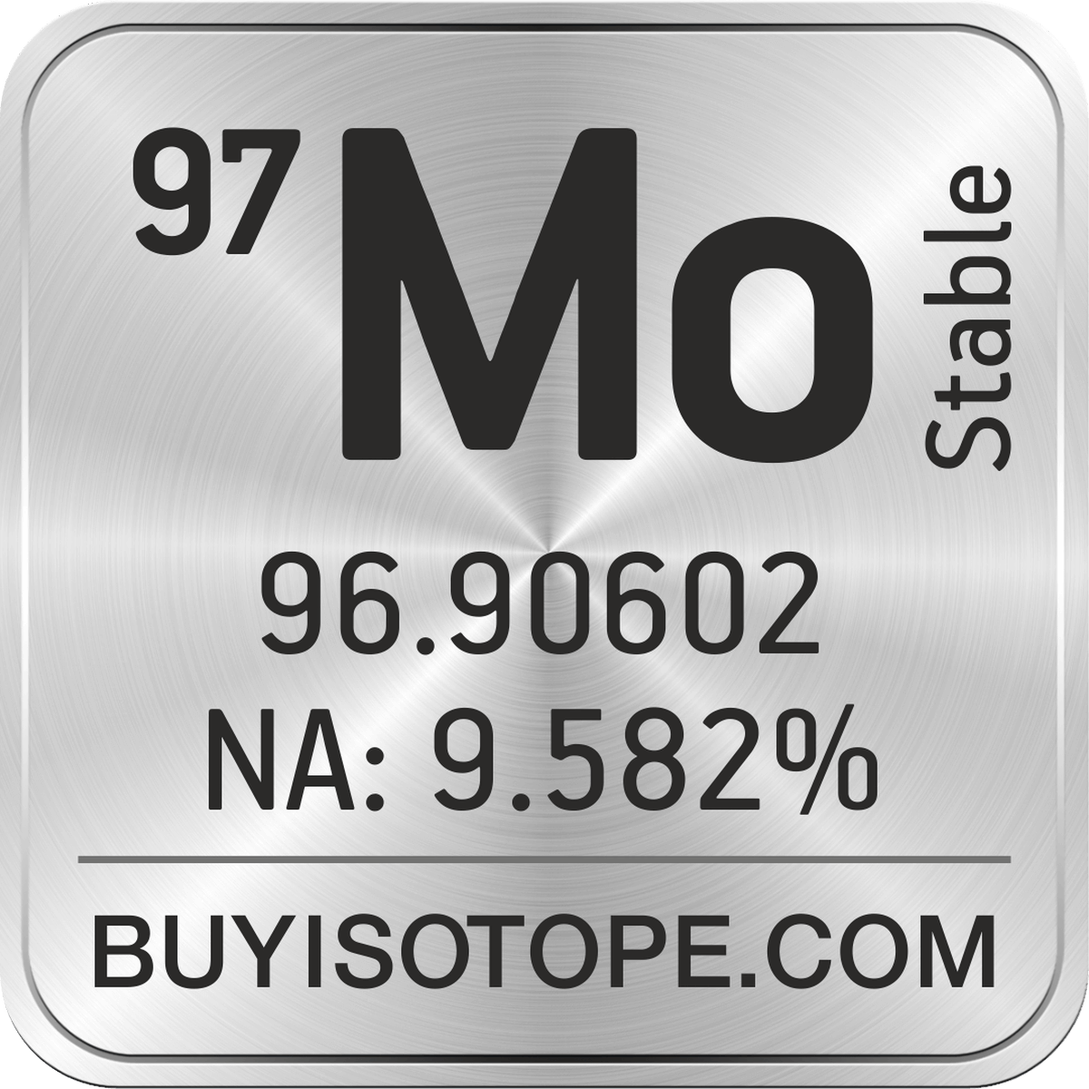 97Mo isotope is available to order from BuyIsotope.com in 97Mo metal (Mo) chemical form and in 97Mo oxide (MoO3) chemical form. Please contact us via request a 97Mo quote BuyIsotope.com to order 97Mo isotope, to get 97Mo price and to buy 97Mo isotope.