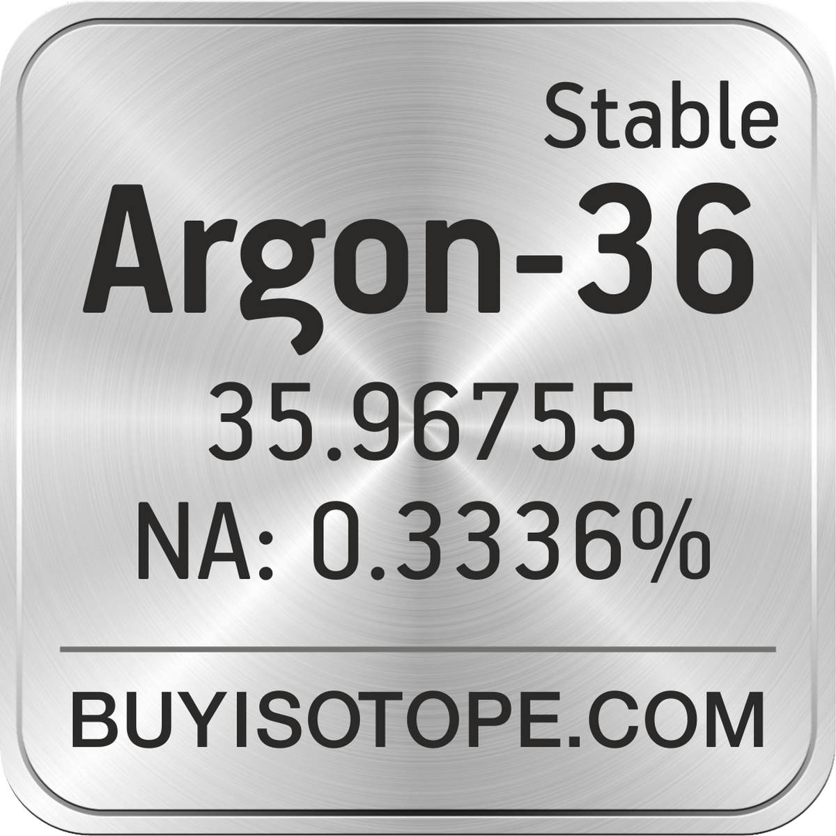 Argon-36 isotope is available to order from BuyIsotope.com in Argon-36 gas (Ar) chemical form. Please contact us via request a Argon-36 quote BuyIsotope.com to order Argon-36 isotope, to get Argon-36 price and to buy Argon-36 isotope.