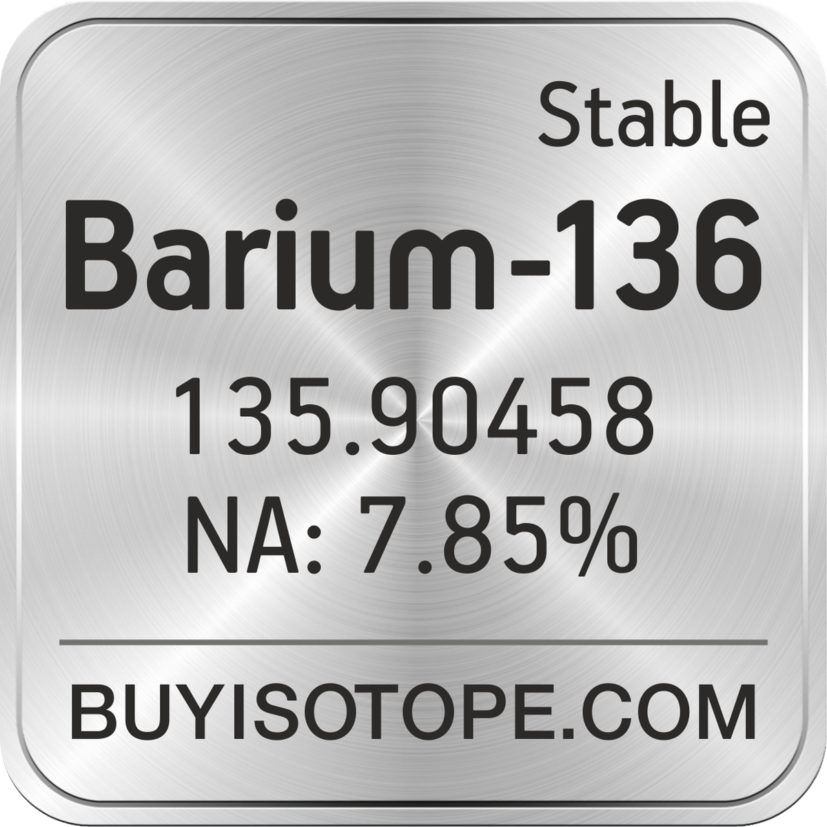 Barium-136 isotope is available to order from BuyIsotope.com in Barium-136 carbonate (BaCO3) chemical form. Please contact us via request a Barium-136 quote BuyIsotope.com to order Barium-136 isotope, to get Barium-136 price and to buy Barium-136 isotope.