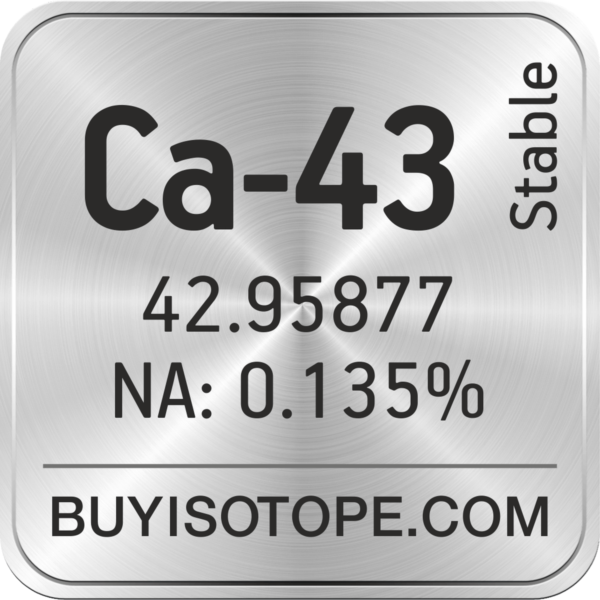 Ca-43 isotope is available to order from BuyIsotope.com in Ca-43 carbonate (CaCO3) chemical form and in Ca-43 oxide (CaO) chemical form. Please contact us via request a Ca-43 quote BuyIsotope.com to order Ca-43 isotope, to get Ca-43 price and to buy Ca-43 isotope.