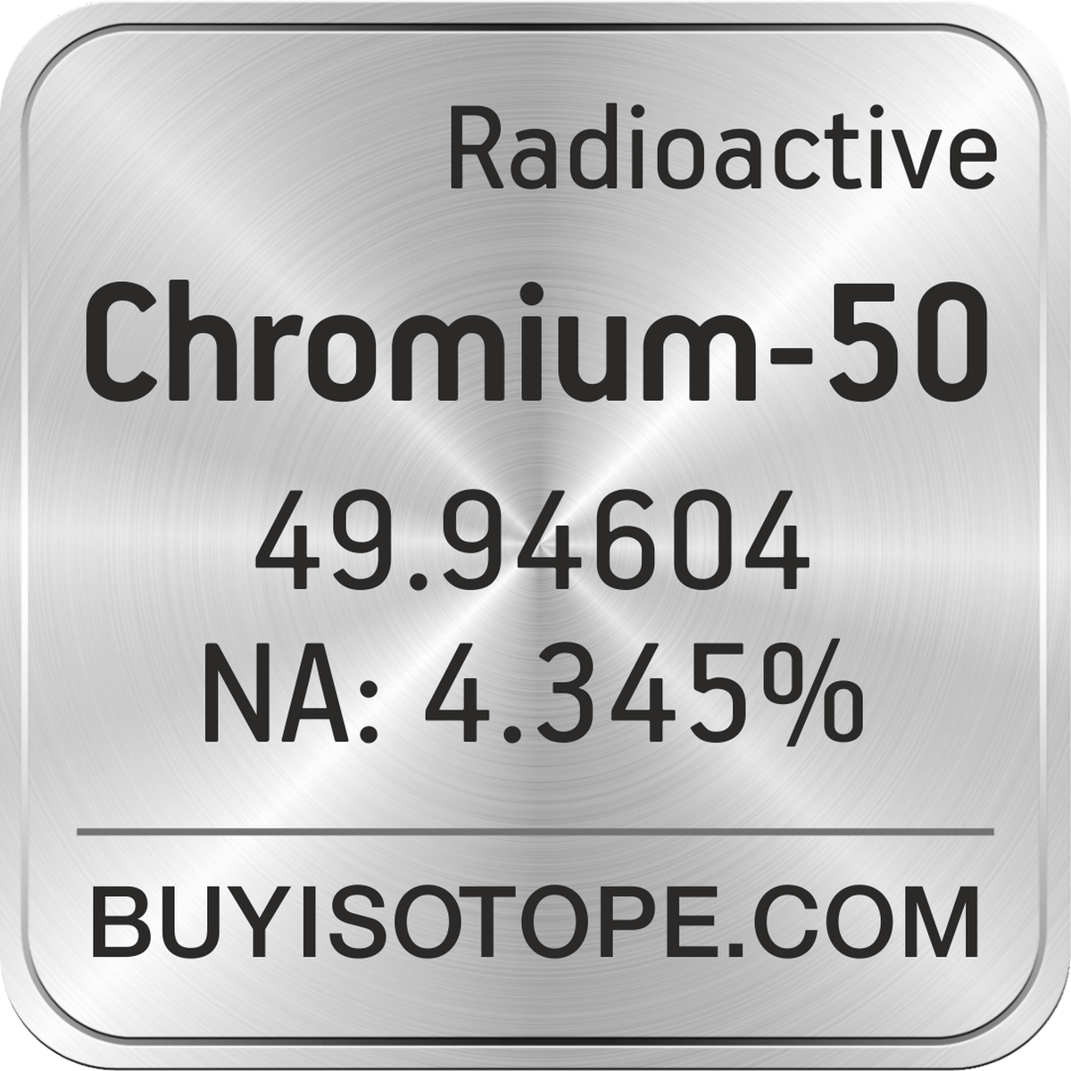 Chromium-50 isotope is available to order from BuyIsotope.com in Chromium-50 metal (Cr) chemical form and in Chromium-50 oxide (Cr2O3) chemical form. Please contact us via request a Chromium-50 quote BuyIsotope.com to order Chromium-50 isotope, to get Chromium-50 price and to buy Chromium-50 isotope.