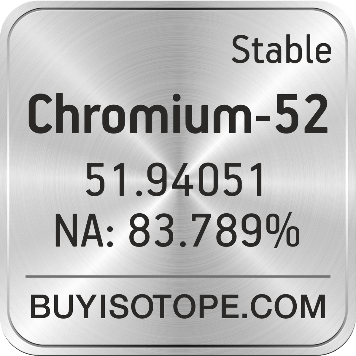 Chromium-52 isotope is available to order from BuyIsotope.com in Chromium-52 metal (Cr) chemical form and in Chromium-52 oxide (Cr2O3) chemical form. Please contact us via request a Chromium-52 quote BuyIsotope.com to order Chromium-52 isotope, to get Chromium-52 price and to buy Chromium-52 isotope.