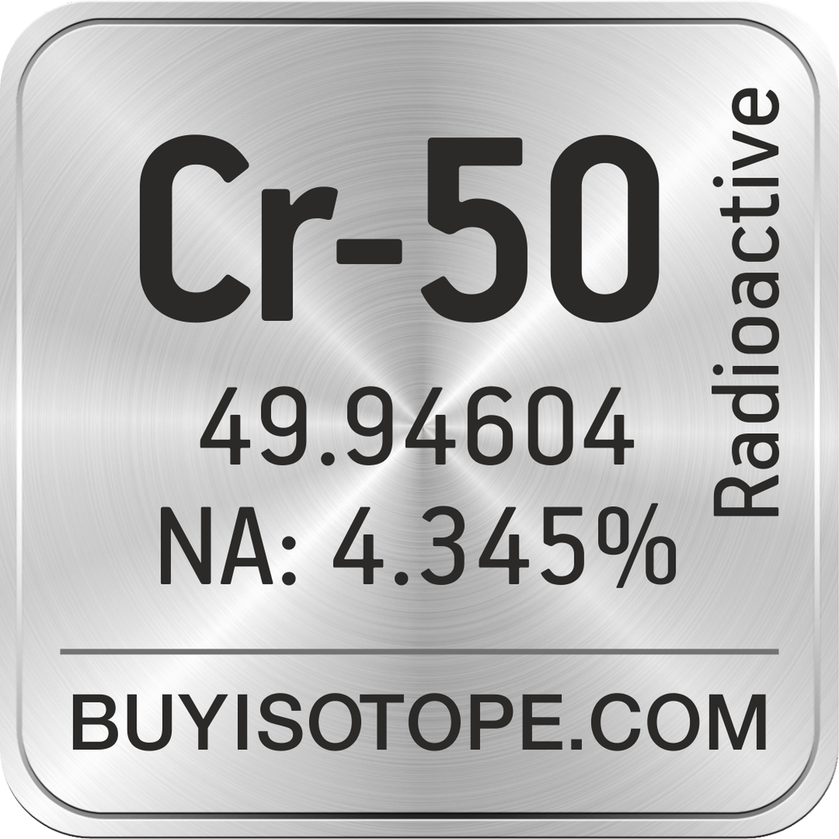 Cr-50 isotope is available to order from BuyIsotope.com in Cr-50 metal (Cr) chemical form and in Cr-50 oxide (Cr2O3) chemical form. Please contact us via request a Cr-50 quote BuyIsotope.com to order Cr-50 isotope, to get Cr-50 price and to buy Cr-50 isotope.