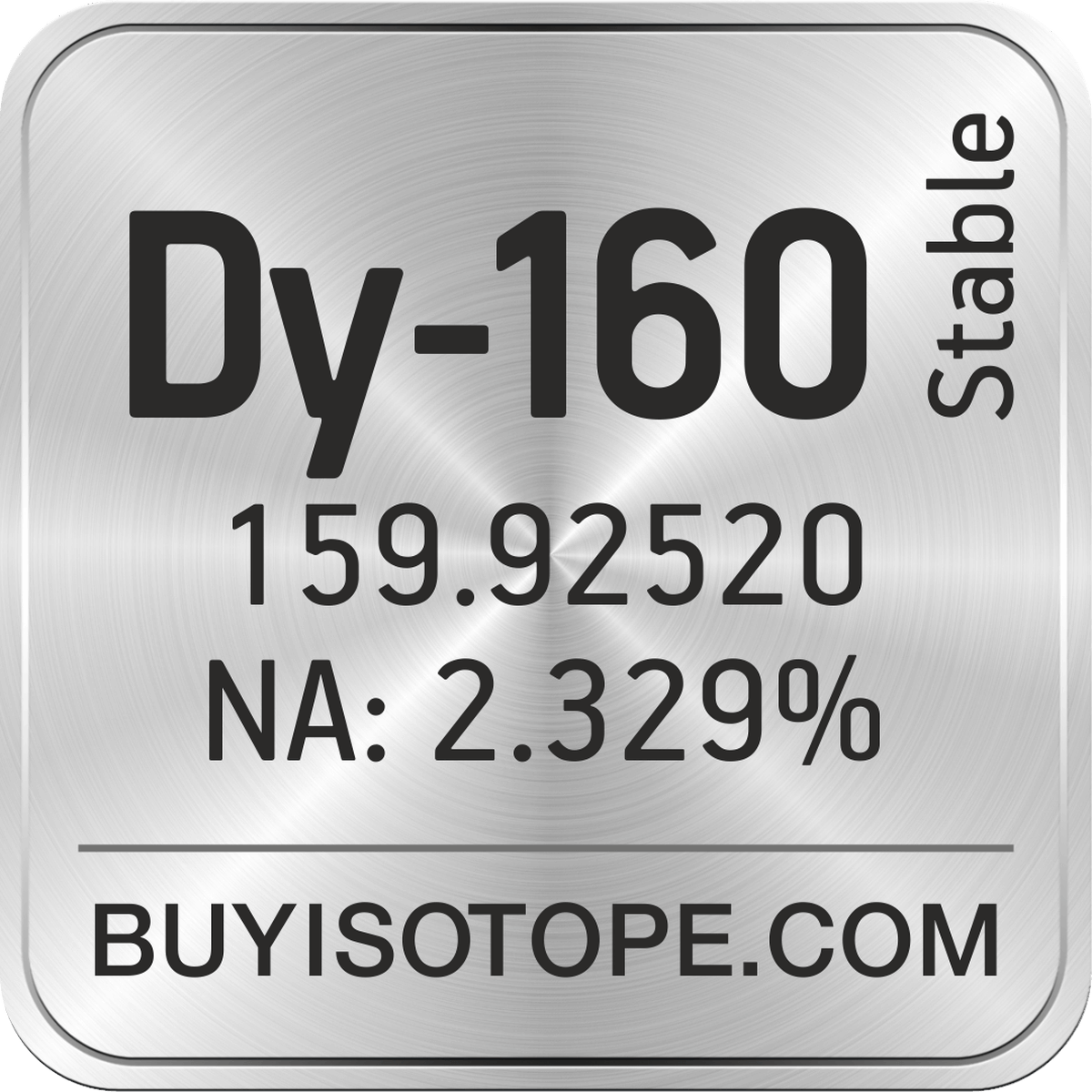 Dy-160 isotope is available to order from BuyIsotope.com in Dy-160 oxide (Dy2O3) chemical form. Please contact us via request a Dy-160 quote BuyIsotope.com to order Dy-160 isotope, to get Dy-160 price and to buy Dy-160 isotope.
