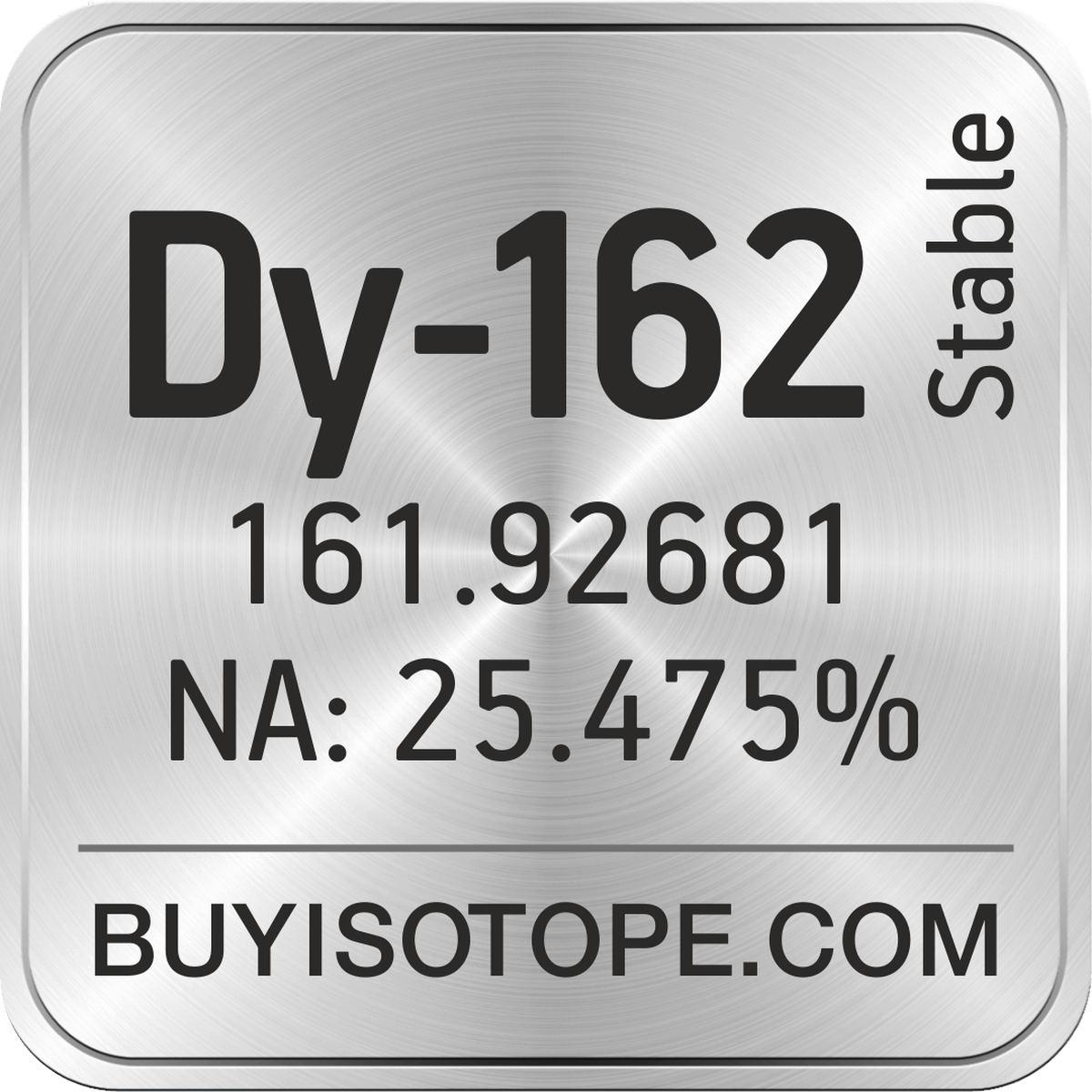 Dy-162 isotope is available to order from BuyIsotope.com in Dy-162 oxide (Dy2O3) chemical form. Please contact us via request a Dy-162 quote BuyIsotope.com to order Dy-162 isotope, to get Dy-162 price and to buy Dy-162 isotope.