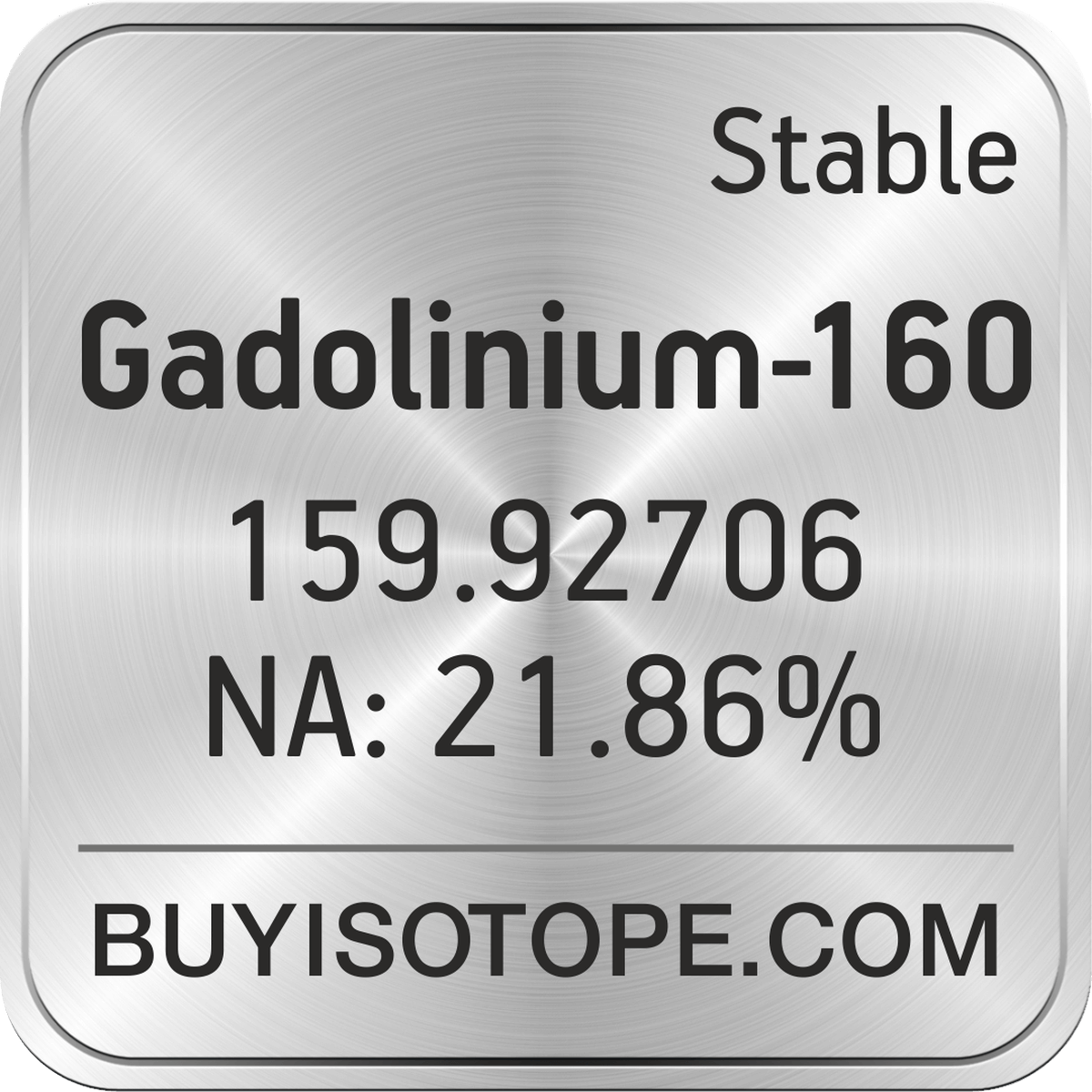 Gadolinium-160 isotope is available to order from BuyIsotope.com in Gadolinium-160 oxide (Gd2O3) chemical form and in Gadolinium-160 metal (Gd) chemical form. Please contact us via request a Gadolinium-160 quote BuyIsotope.com to order Gadolinium-160 isotope, to get Gadolinium-160 price and to buy Gadolinium-160 isotope.