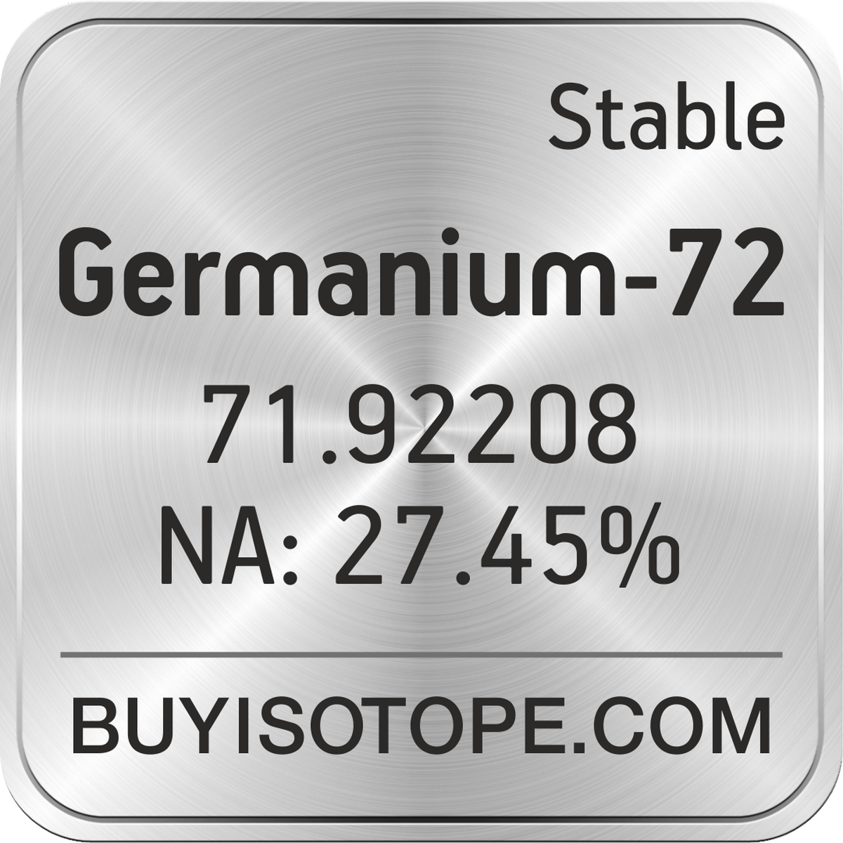 Germanium-72 isotope is available to order from BuyIsotope.com in Germanium-72 metal (Ge) chemical form and in Germanium-72 oxide (GeO2) chemical form. Please contact us via request a Germanium-72 quote BuyIsotope.com to order Germanium-72 isotope, to get Germanium-72 price and to buy Germanium-72 isotope.