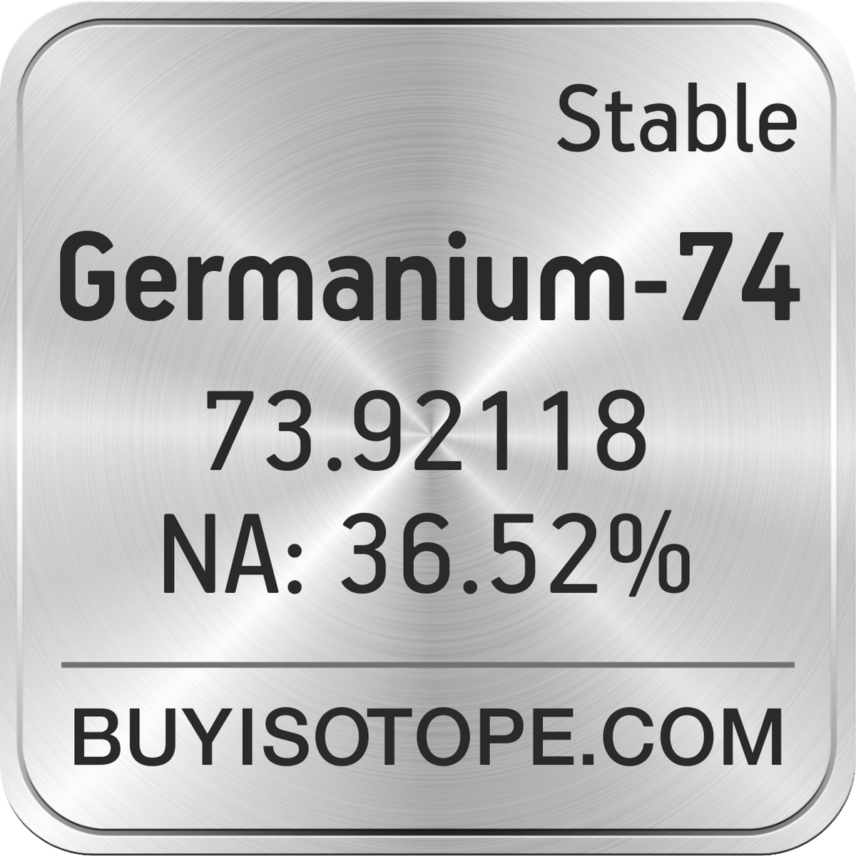 Germanium-74 isotope is available to order from BuyIsotope.com in Germanium-74 metal (Ge) chemical form and in Germanium-74 oxide (GeO2) chemical form. Please contact us via request a Germanium-74 quote BuyIsotope.com to order Germanium-74 isotope, to get Germanium-74 price and to buy Germanium-74 isotope.