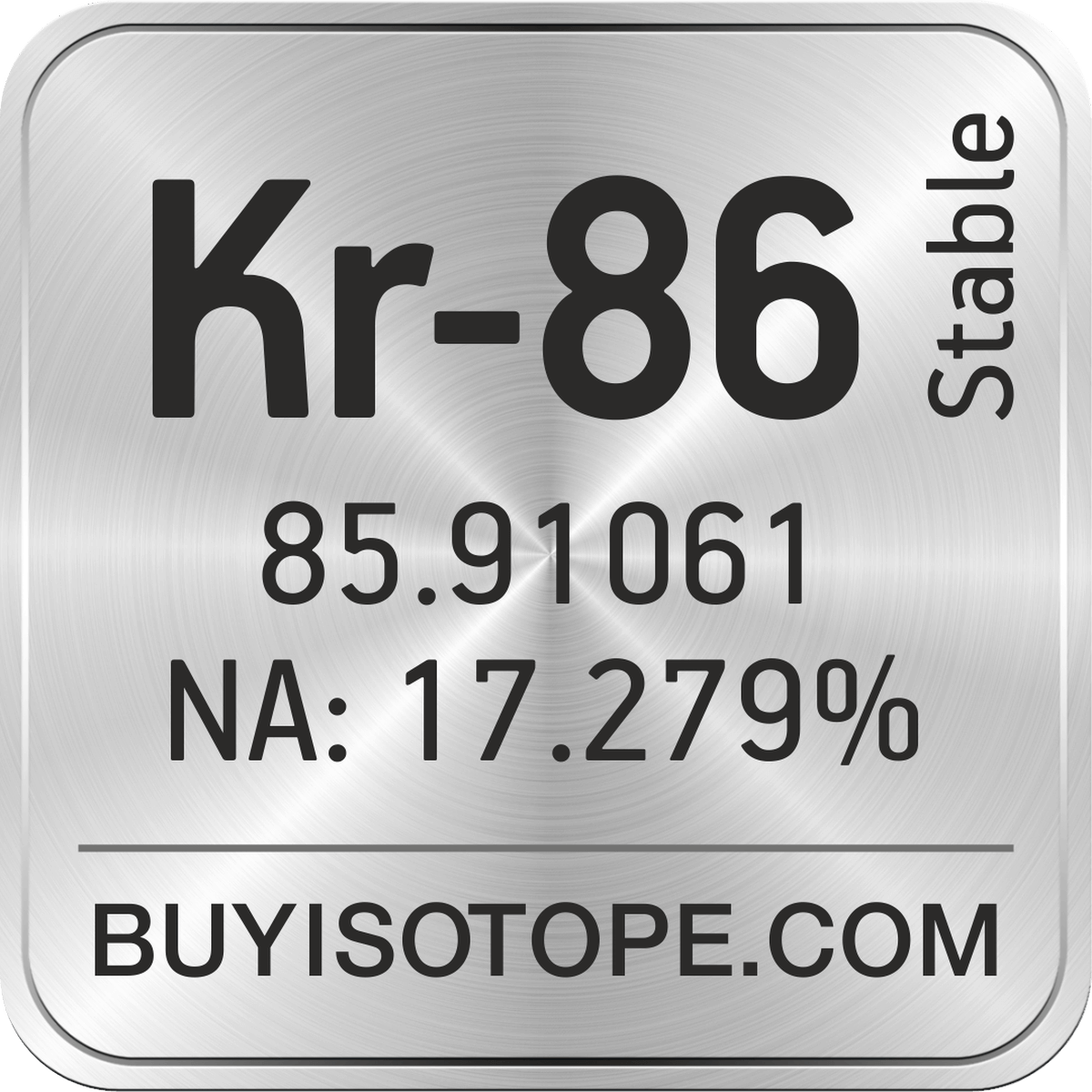 Kr-86 isotope is available to order from BuyIsotope.com in Kr-86 gas (Kr) chemical form. Please contact us via request a Kr-86 quote BuyIsotope.com to order Kr-86 isotope, to get Kr-86 price and to buy Kr-86 isotope.