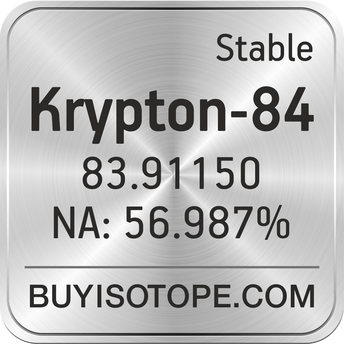 Krypton-84 isotope is available to order from BuyIsotope.com in Krypton-84 gas (Kr) chemical form. Please contact us via request a Krypton-84 quote BuyIsotope.com to order Krypton-84 isotope, to get Krypton-84 price and to buy Krypton-84 isotope.