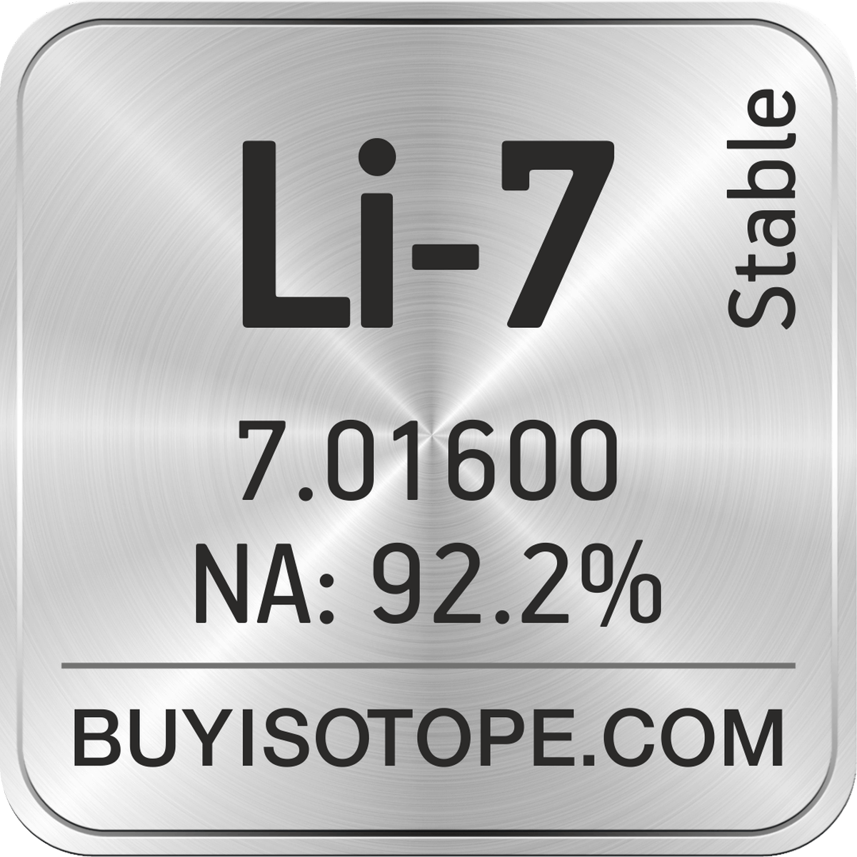 Li-7 isotope is available to order from BuyIsotope.com in Li-7 metal (Li) chemical form and in Li-7 hydroxide (LiOH H2O) chemical form. Please contact us via request a Li-7 quote BuyIsotope.com to order Li-7 isotope, to get Li-7 price and to buy Li-7 isotope.