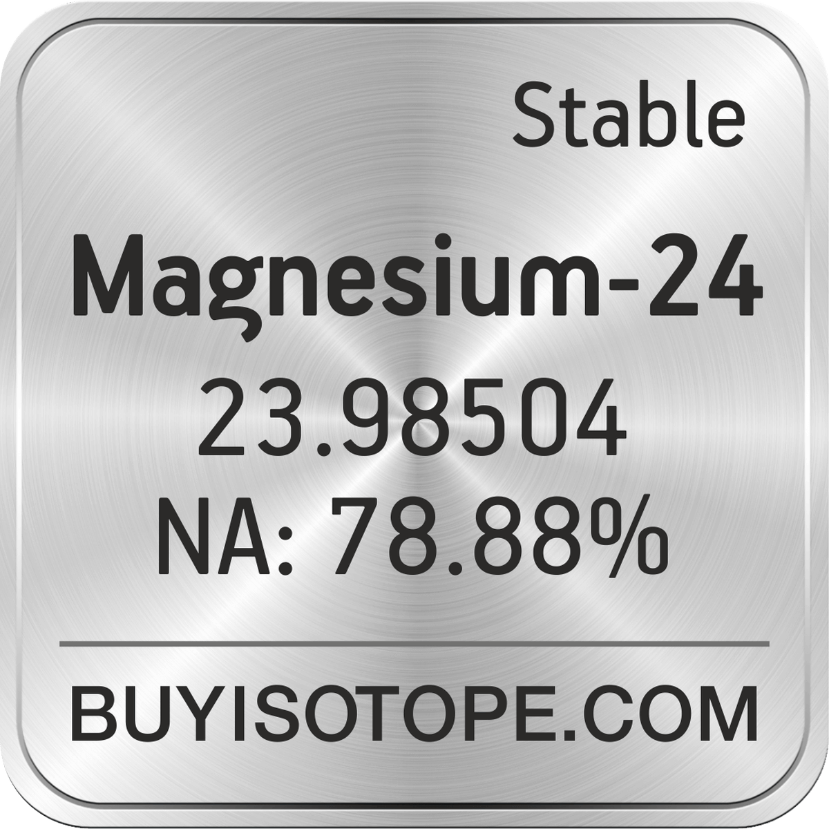 Magnesium-24 isotope is available to order from BuyIsotope.com in Magnesium-24 oxide (MgO) chemical form and in Magnesium-24 metal (Mg) chemical form. Please contact us via request a Magnesium-24 quote BuyIsotope.com to order Magnesium-24 isotope, to get Magnesium-24 price and to buy Magnesium-24 isotope.