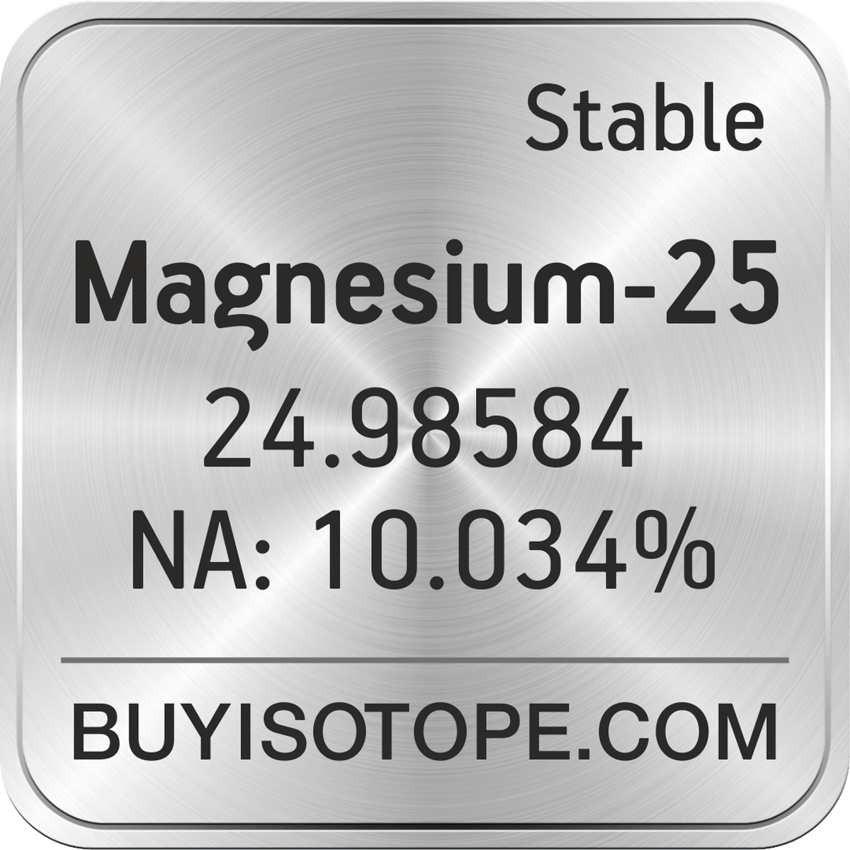 Magnesium-25 isotope is available to order from BuyIsotope.com in Magnesium-25 oxide (MgO) chemical form and in Magnesium-25 metal (Mg) chemical form. Please contact us via request a Magnesium-25 quote BuyIsotope.com to order Magnesium-25 isotope, to get Magnesium-25 price and to buy Magnesium-25 isotope.