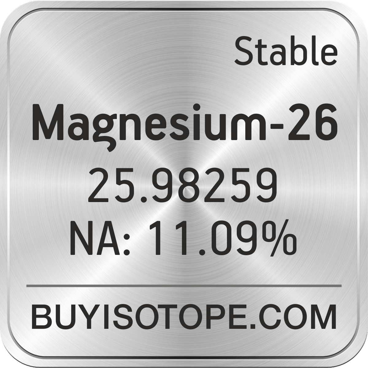 Magnesium-26 isotope is available to order from BuyIsotope.com in Magnesium-26 oxide (MgO) chemical form and in Magnesium-26 metal (Mg) chemical form. Please contact us via request a Magnesium-26 quote BuyIsotope.com to order Magnesium-26 isotope, to get Magnesium-26 price and to buy Magnesium-26 isotope.