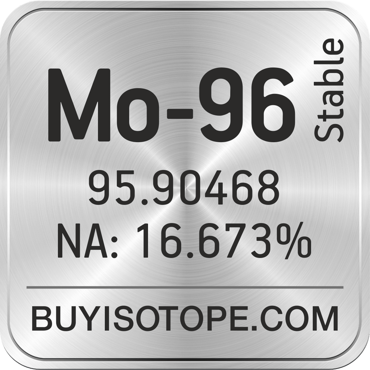 Mo-96 isotope is available to order from BuyIsotope.com in Mo-96 metal (Mo) chemical form and in Mo-96 oxide (MoO3) chemical form. Please contact us via request a Mo-96 quote BuyIsotope.com to order Mo-96 isotope, to get Mo-96 price and to buy Mo-96 isotope.