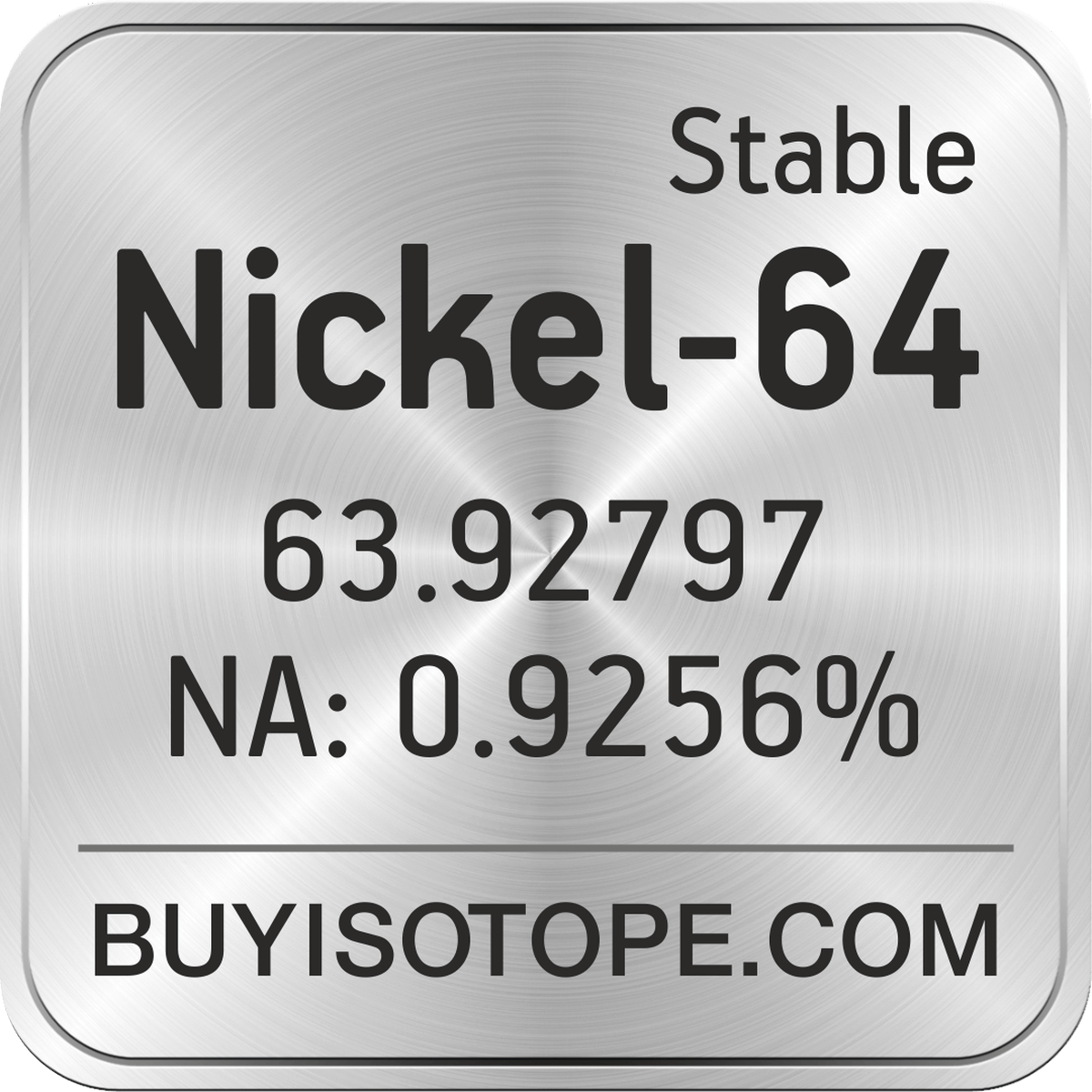 Nickel-64 isotope is available to order from BuyIsotope.com in Nickel-64 metal powder (Ni) chemical form and in Nickel-64 oxide (NiO) chemical form. Please contact us via request a Nickel-64 quote BuyIsotope.com to order Nickel-64 isotope, to get Nickel-64 price and to buy Nickel-64 isotope.