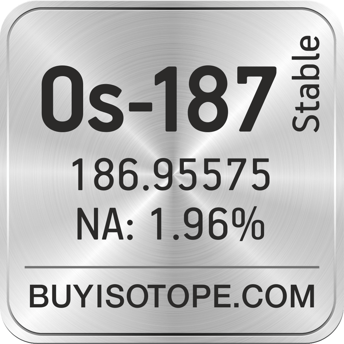 Os-187 isotope is available to order from BuyIsotope.com in Os-187 metal (Os) chemical form. Please contact us via request a Os-187 quote BuyIsotope.com to order Os-187 isotope, to get Os-187 price and to buy Os-187 isotope.