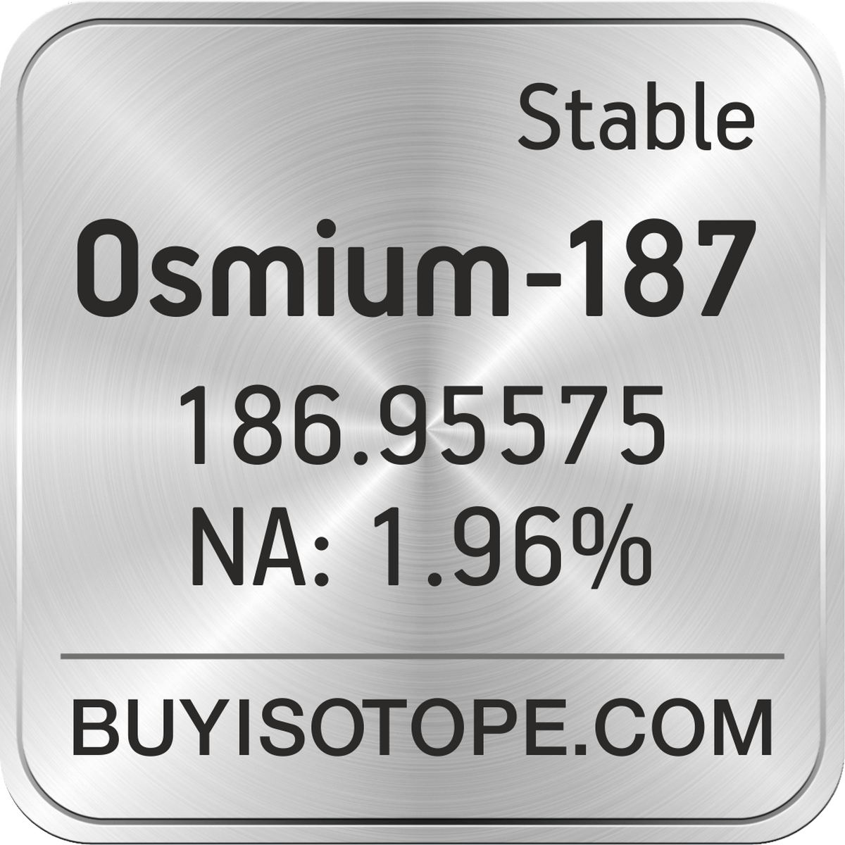 Osmium-187 isotope is available to order from BuyIsotope.com in Osmium-187 metal (Os) chemical form. Please contact us via request a Osmium-187 quote BuyIsotope.com to order Osmium-187 isotope, to get Osmium-187 price and to buy Osmium-187 isotope.