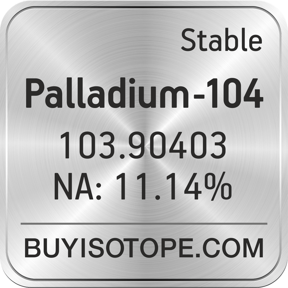 Palladium-104 isotope is available to order from BuyIsotope.com in Palladium-104 metal ingot (Pd) chemical form and in Palladium-104 metal powder (Pd) chemical form. Please contact us via request a Palladium-104 quote BuyIsotope.com to order Palladium-104 isotope, to get Palladium-104 price and to buy Palladium-104 isotope.
