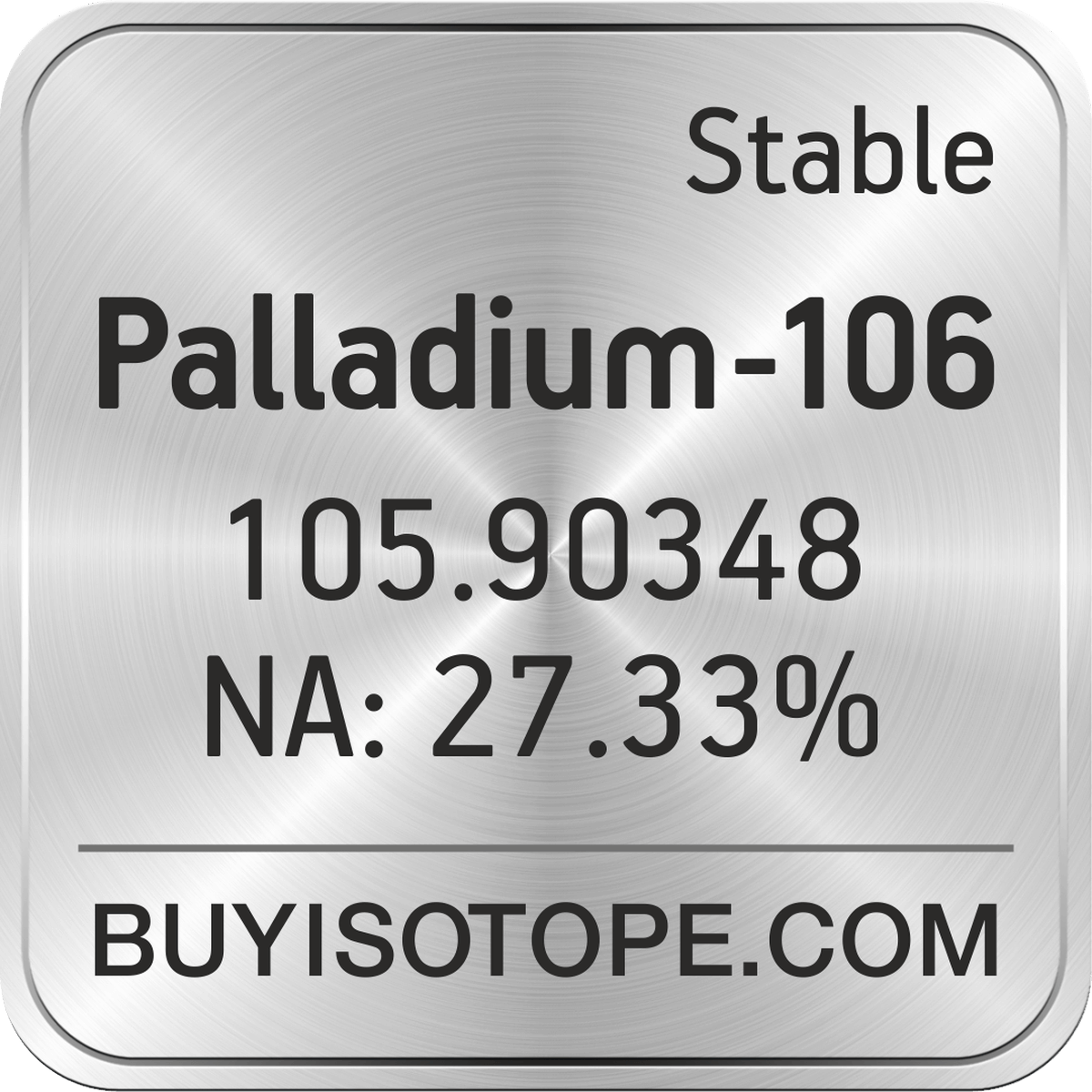 Palladium-106 isotope is available to order from BuyIsotope.com in Palladium-106 metal ingot (Pd) chemical form and in Palladium-106 metal powder (Pd) chemical form. Please contact us via request a Palladium-106 quote BuyIsotope.com to order Palladium-106 isotope, to get Palladium-106 price and to buy Palladium-106 isotope.
