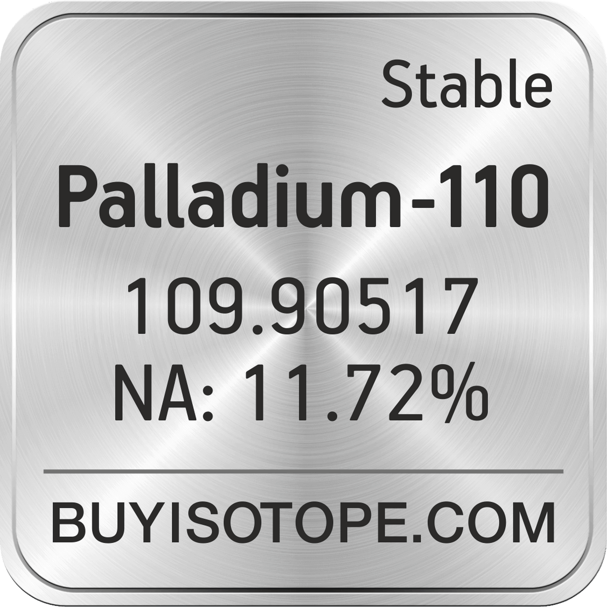 Palladium-110 isotope is available to order from BuyIsotope.com in Palladium-110 metal ingot (Pd) chemical form and in Palladium-110 metal powder (Pd) chemical form. Please contact us via request a Palladium-110 quote BuyIsotope.com to order Palladium-110 isotope, to get Palladium-110 price and to buy Palladium-110 isotope.