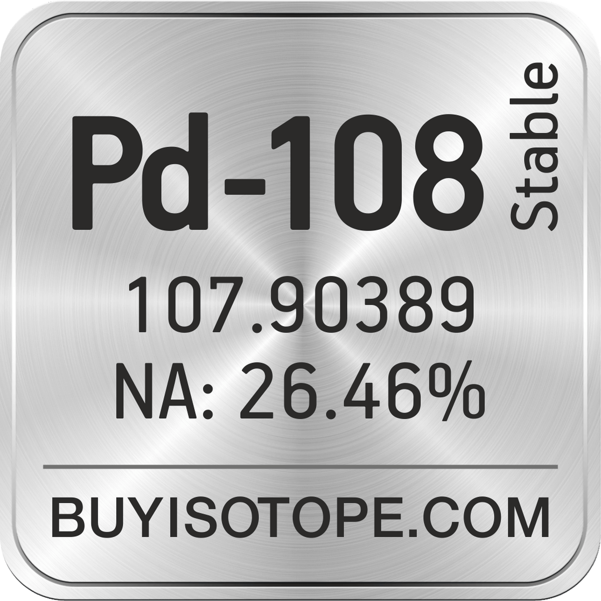 Pd-108 isotope is available to order from BuyIsotope.com in Pd-108 metal ingot (Pd) chemical form and in Pd-108 metal powder (Pd) chemical form. Please contact us via request a Pd-108 quote BuyIsotope.com to order Pd-108 isotope, to get Pd-108 price and to buy Pd-108 isotope.