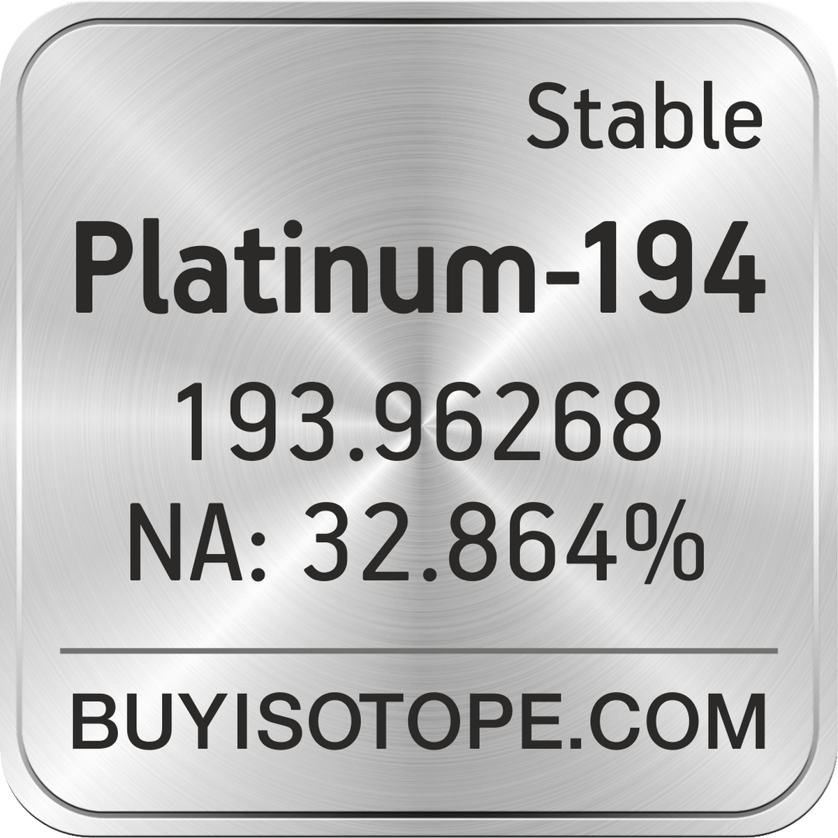 Platinum-194 isotope is available to order from BuyIsotope.com in Platinum-194 metal foil (Pt) chemical form and in Platinum-194 metal powder (Pt) chemical form. Please contact us via request a Platinum-194 quote BuyIsotope.com to order Platinum-194 isotope, to get Platinum-194 price and to buy Platinum-194 isotope.