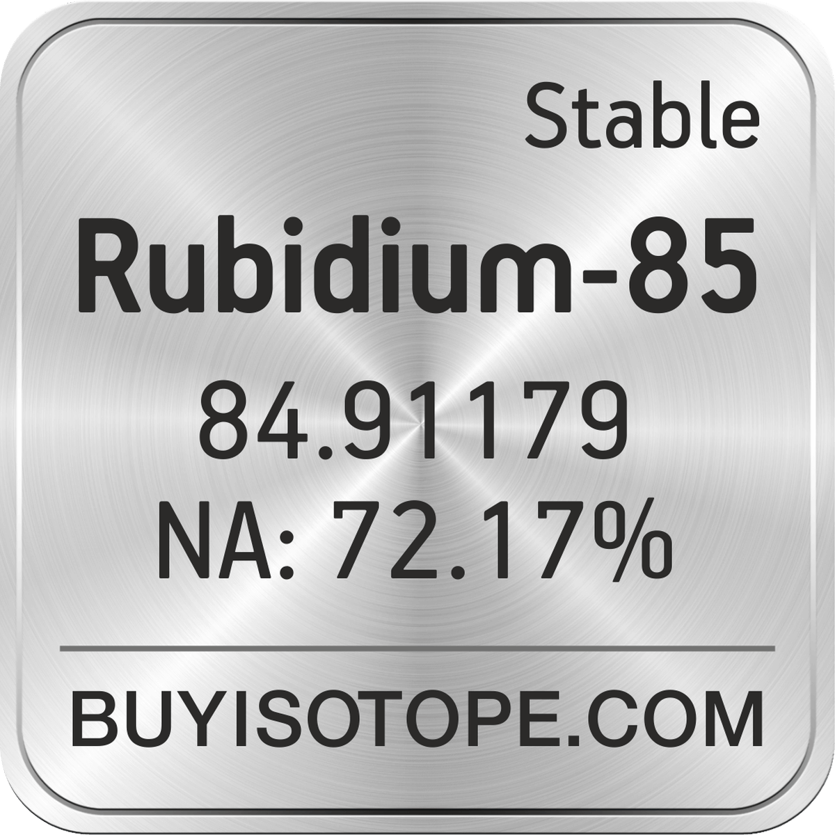 Rubidium-85 isotope is available to order from BuyIsotope.com in Rubidium-85 metal (Rb) chemical form and in Rubidium-85 chloride (RbCl) chemical form. Please contact us via request a Rubidium-85 quote BuyIsotope.com to order Rubidium-85 isotope, to get Rubidium-85 price and to buy Rubidium-85 isotope.