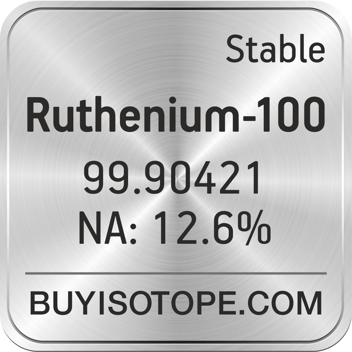 Ruthenium-100 isotope is available to order from BuyIsotope.com in Ruthenium-100 metal foil (Ru) chemical form and in Ruthenium-100 metal powder (Ru) chemical form. Please contact us via request a Ruthenium-100 quote BuyIsotope.com to order Ruthenium-100 isotope, to get Ruthenium-100 price and to buy Ruthenium-100 isotope.