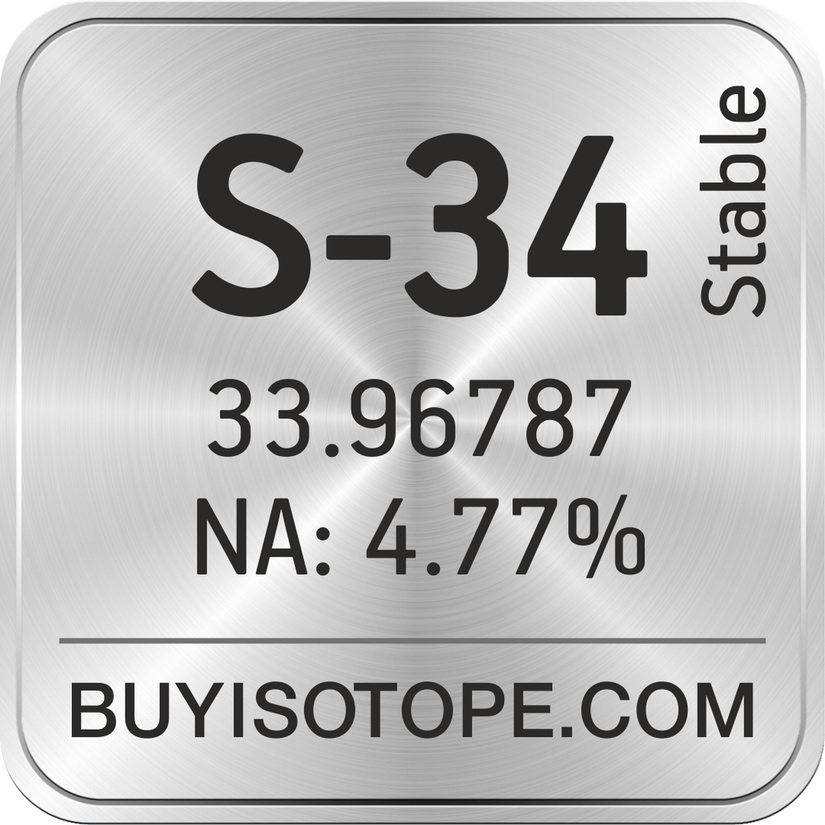 S-34 isotope is available to order from BuyIsotope.com in S-34 elemental (S) chemical form. Please contact us via request a S-34 quote BuyIsotope.com to order S-34 isotope, to get S-34 price and to buy S-34 isotope.