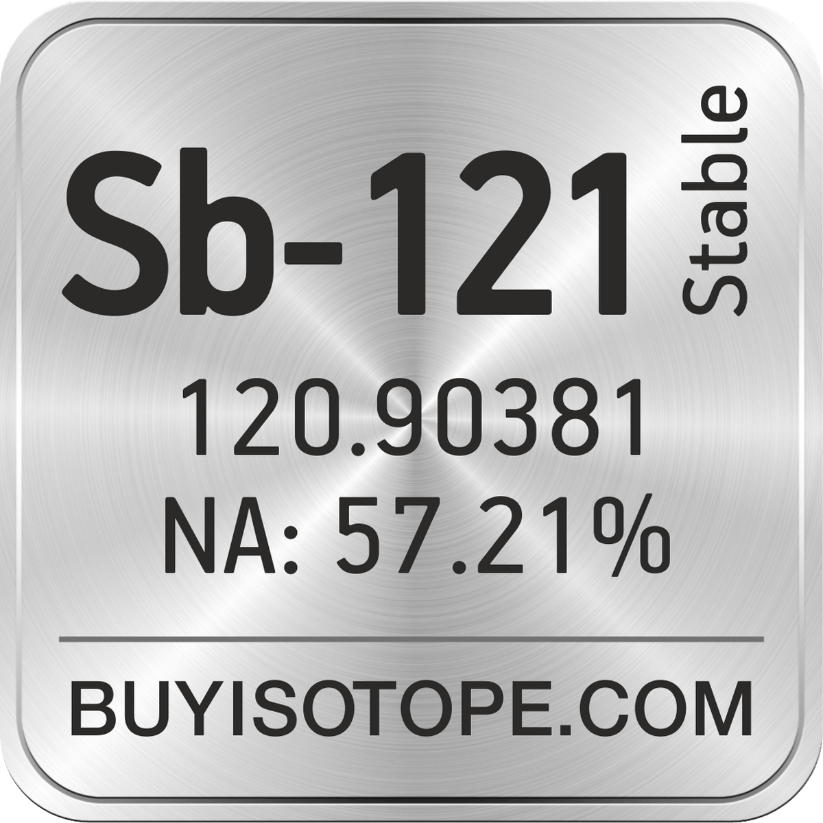 Sb-121 isotope is available to order from BuyIsotope.com in Sb-121 metal (Sb) chemical form and in Sb-121 oxide (Sb2O3) chemical form. Please contact us via request a Sb-121 quote BuyIsotope.com to order Sb-121 isotope, to get Sb-121 price and to buy Sb-121 isotope.