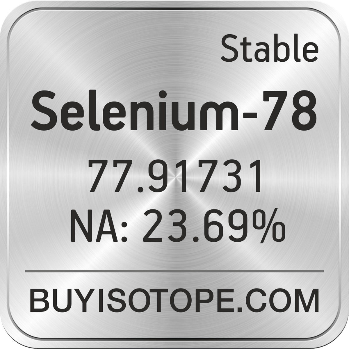 Selenium-78 isotope is available to order from BuyIsotope.com in Selenium-78 elemental (Se) chemical form. Please contact us via request a Selenium-78 quote BuyIsotope.com to order Selenium-78 isotope, to get Selenium-78 price and to buy Selenium-78 isotope.