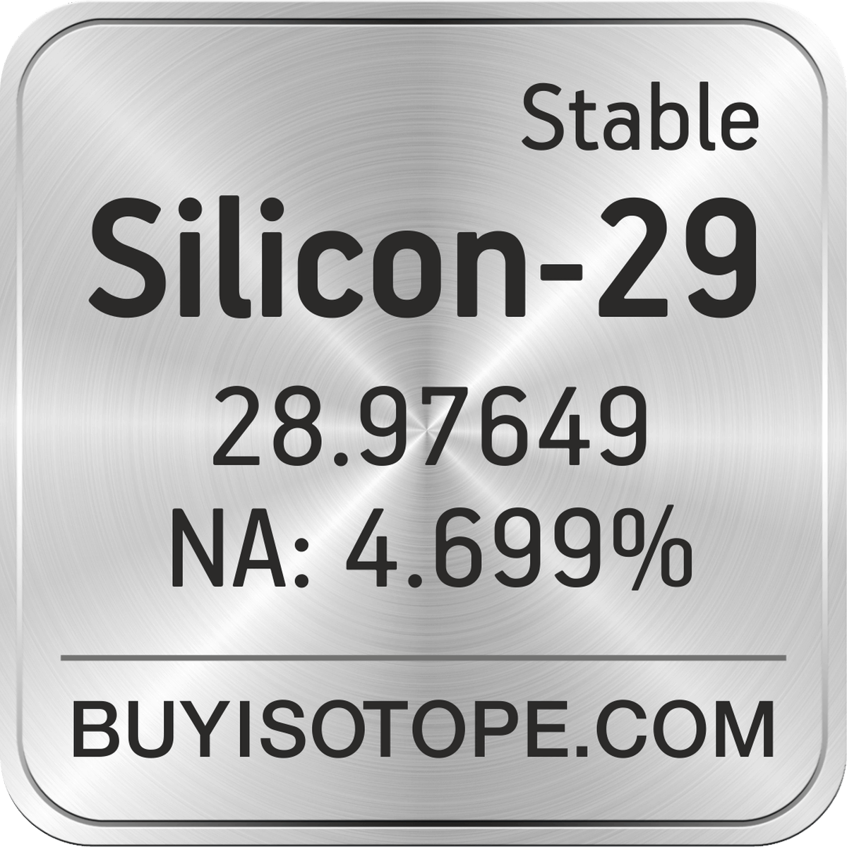 Silicon-29 isotope is available to order from BuyIsotope.com in Silicon-29 elemental (Si) chemical form and in Silicon-29 oxide (SiO2) chemical form. Please contact us via request a Silicon-29 quote BuyIsotope.com to order Silicon-29 isotope, to get Silicon-29 price and to buy Silicon-29 isotope.