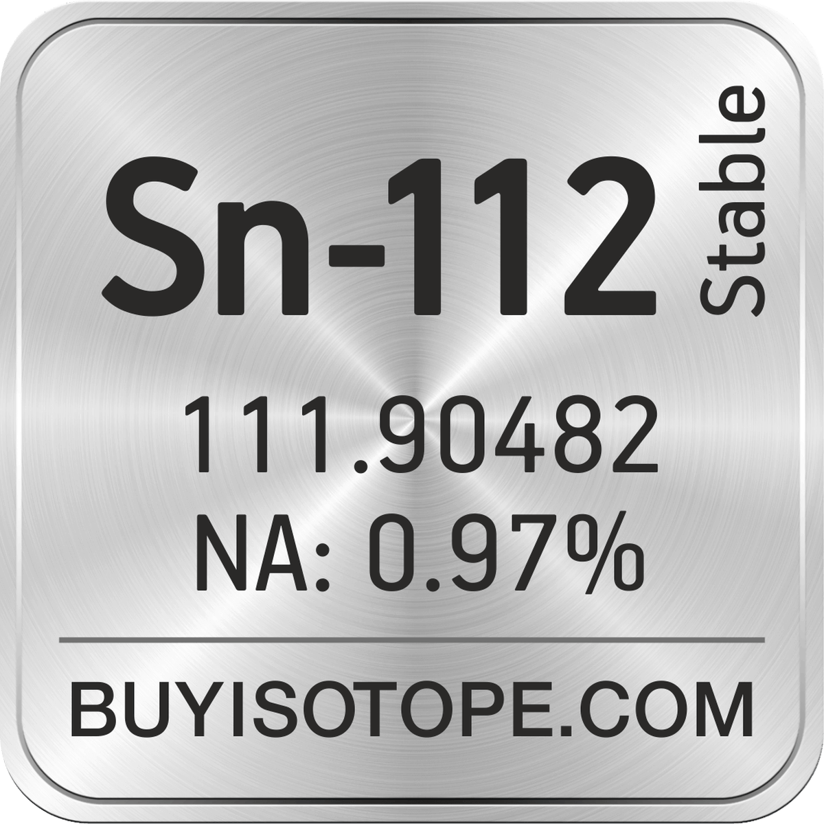 Sn-112 isotope is available to order from BuyIsotope.com in Sn-112 metal (Sn) chemical form. Please contact us via request a Sn-112 quote BuyIsotope.com to order Sn-112 isotope, to get Sn-112 price and to buy Sn-112 isotope.