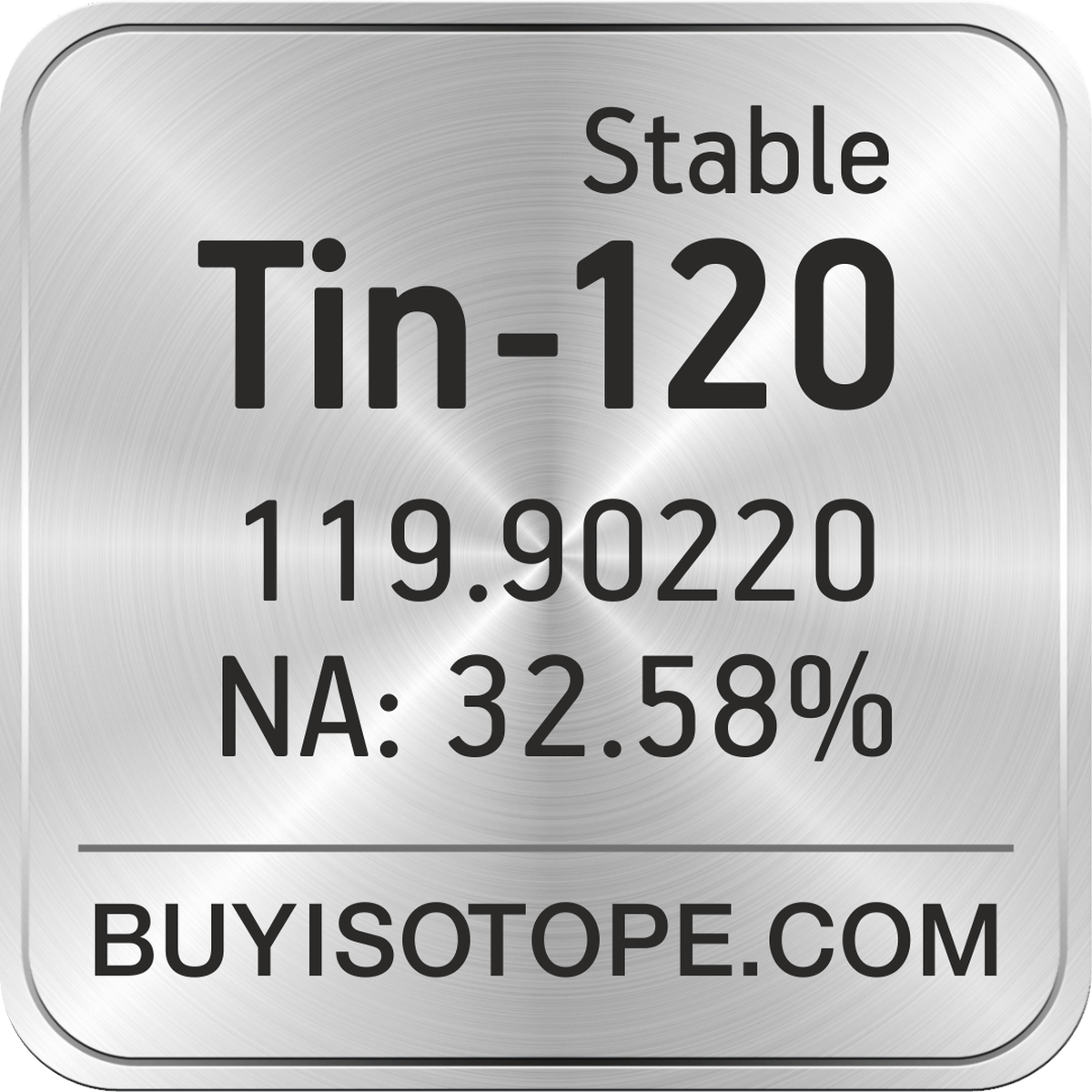 Tin-120 isotope is available to order from BuyIsotope.com in Tin-120 metal (Sn) chemical form. Please contact us via request a Tin-120 quote BuyIsotope.com to order Tin-120 isotope, to get Tin-120 price and to buy Tin-120 isotope.