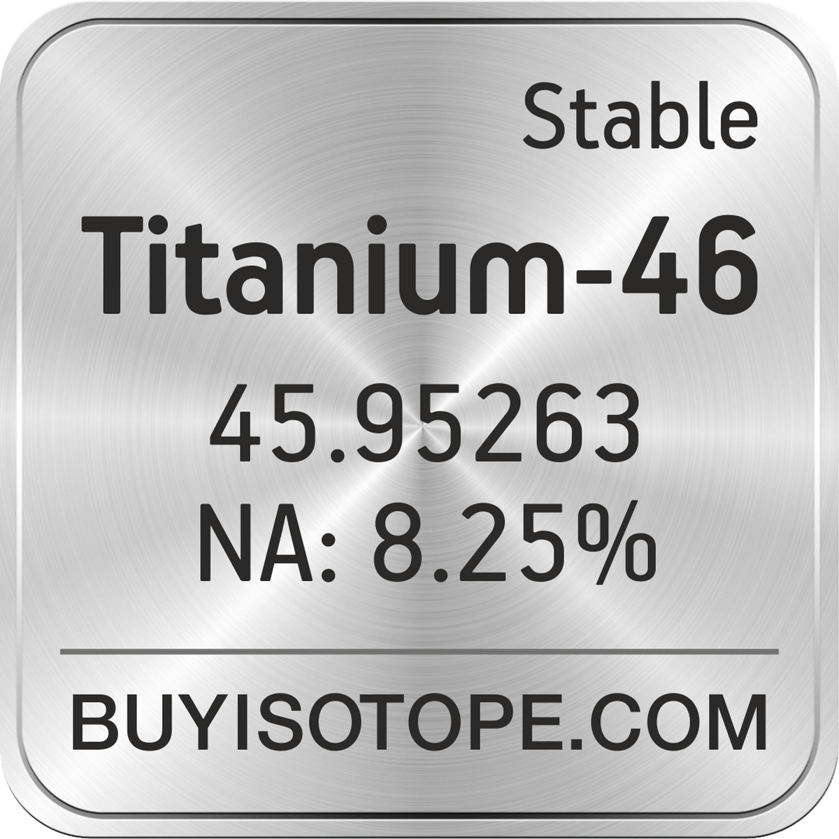 Titanium-46 isotope is available to order from BuyIsotope.com in Titanium-46 metal powder (Ti) chemical form and in Titanium-46 oxide (TiO2) chemical form. Please contact us via request a Titanium-46 quote BuyIsotope.com to order Titanium-46 isotope, to get Titanium-46 price and to buy Titanium-46 isotope.