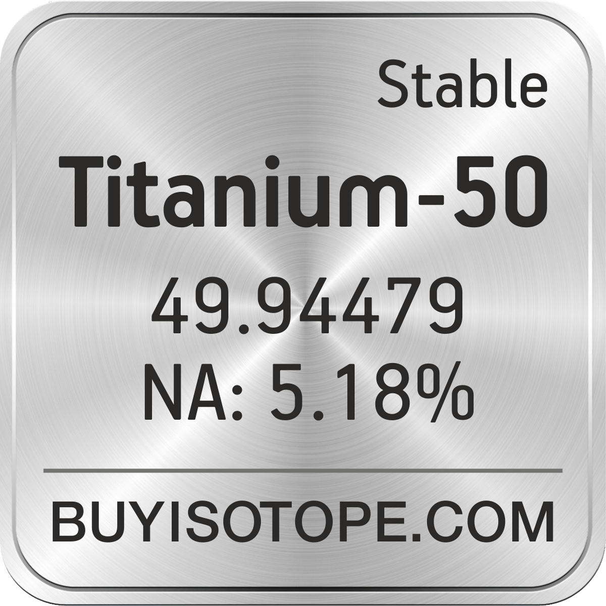 Titanium-50 isotope is available to order from BuyIsotope.com in Titanium-50 metal powder (Ti) chemical form and in Titanium-50 oxide (TiO2) chemical form. Please contact us via request a Titanium-50 quote BuyIsotope.com to order Titanium-50 isotope, to get Titanium-50 price and to buy Titanium-50 isotope.