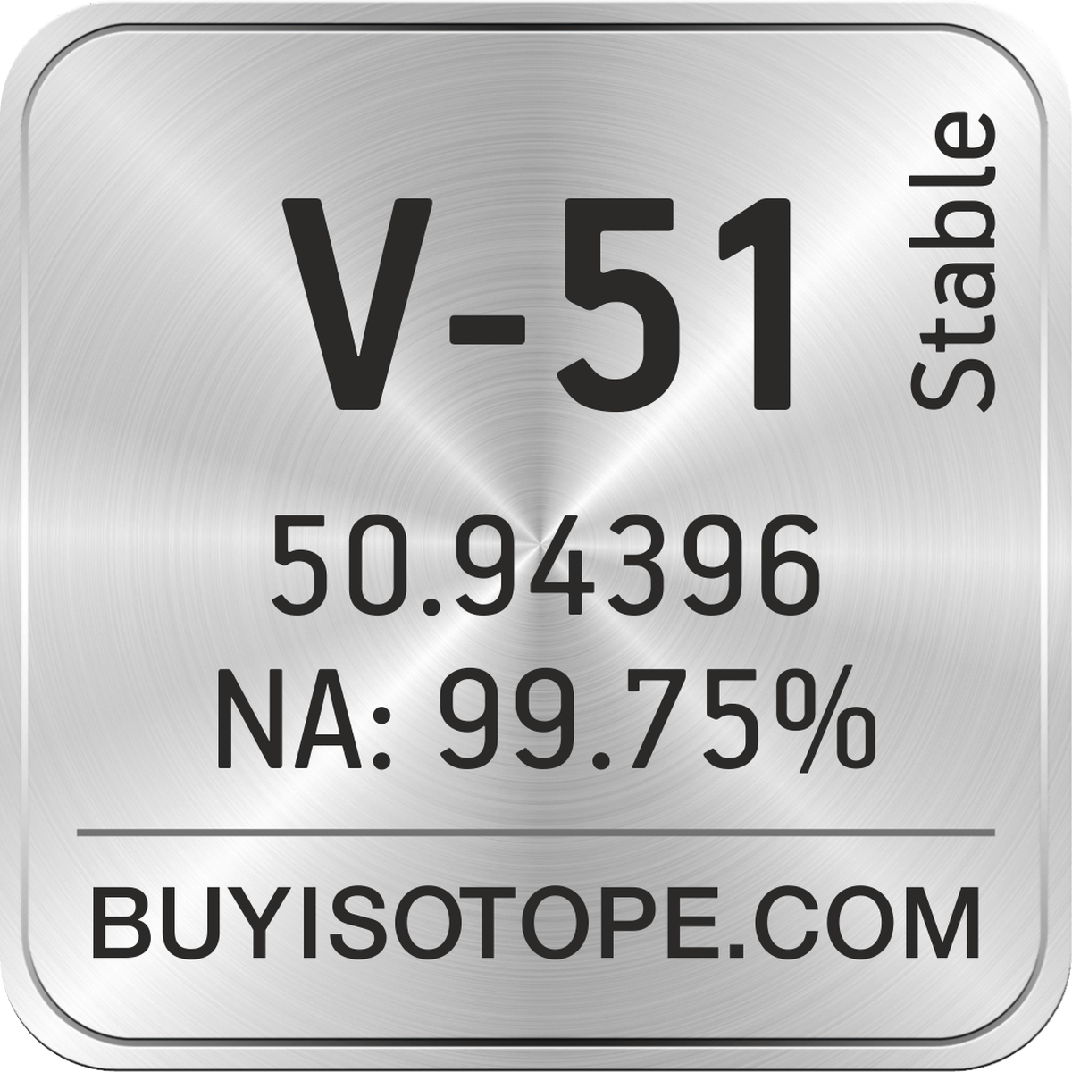 V-51 isotope is available to order from BuyIsotope.com in V-51 oxide (V2O5) chemical form and in V-51 metal (V) chemical form. Please contact us via request a V-51 quote BuyIsotope.com to order V-51 isotope, to get V-51 price and to buy V-51 isotope.