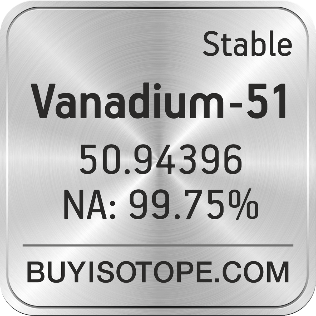 Vanadium-51 isotope is available to order from BuyIsotope.com in Vanadium-51 oxide (V2O5) chemical form and in Vanadium-51 metal (V) chemical form. Please contact us via request a Vanadium-51 quote BuyIsotope.com to order Vanadium-51 isotope, to get Vanadium-51 price and to buy Vanadium-51 isotope.